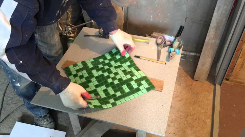Шаг 2. Выкладывайте мозаичную плитку на сетке поверх клея. К слову, одну такую плитку заранее разберите на камешки, которыми будете заполнять пустоты между фрагментами и вдоль стен.