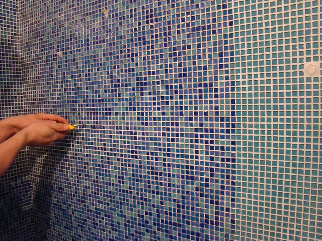 Затирку для мозаики можно выбирать в тон плитке или контрастирующую с ней, это зависит от варианта художественного решения. Кроме того, цвет затирки участков поверхностей, отделанных разной мозаикой, и плитки бордюров могут отличаться друг от друга.