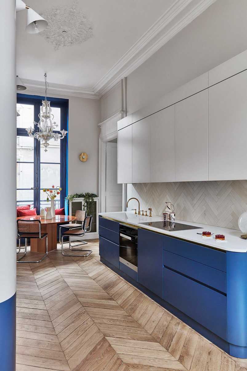 В просторной освещенной кухне синий вполне может стать основным цветом пола, стен и гарнитура. Оптимальной пропорцией разбавления синего цвета считается 1:1 либо 1:2