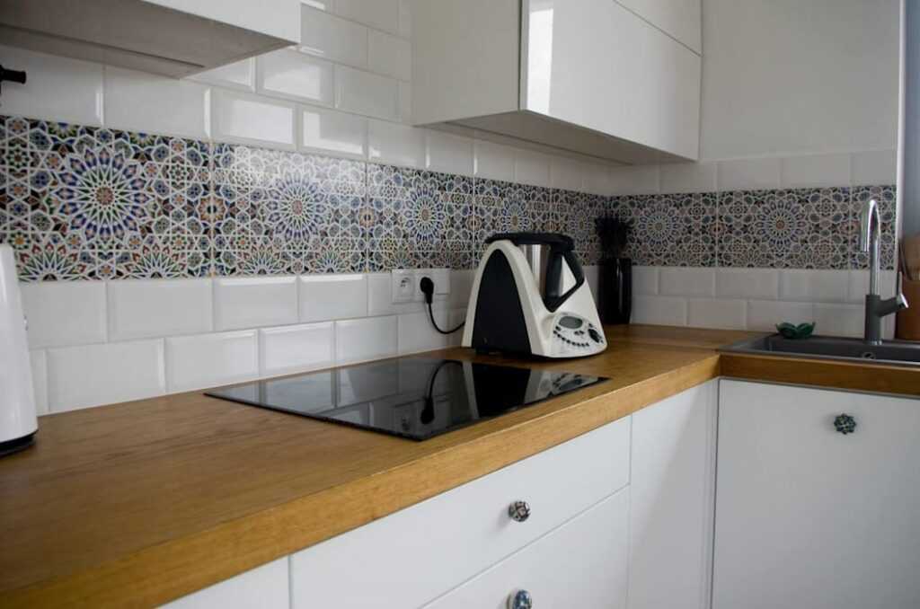 Довольно редкий, но от этого не менее оригинальный вариант создания гармонии облицовки в кухонном помещении. Вы легко обеспечите помещение дополнительным уютом и оригинальностью, если укладка плитки на кухне произойдет не только классическим способом — на стены и на пол, но захватит и рабочие поверхности – стол, подоконник, тумбу и так далее.