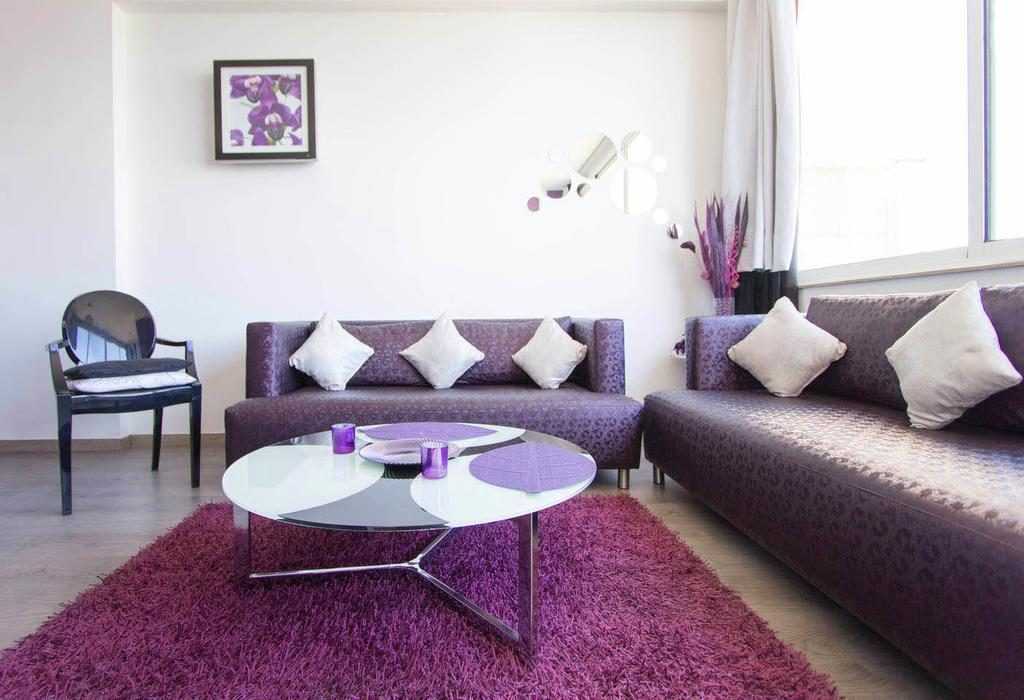 Пурпурные оттенки в интерьере не будут напрягать, если приобрести такой расцветки покрывала, пледы, коврики с высоким ворсом, постельное белье и шторы.