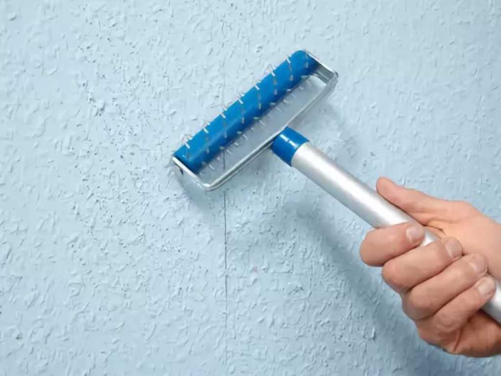 Чтобы создать отверстия на обоях для доступа к клеевому слою, можно использовать специальный валик с гвоздиками или приспособление для создания насечек, известное как «обойный тигр». Прокатывая инструмент по поверхности, можно без усилий создать много насечек.