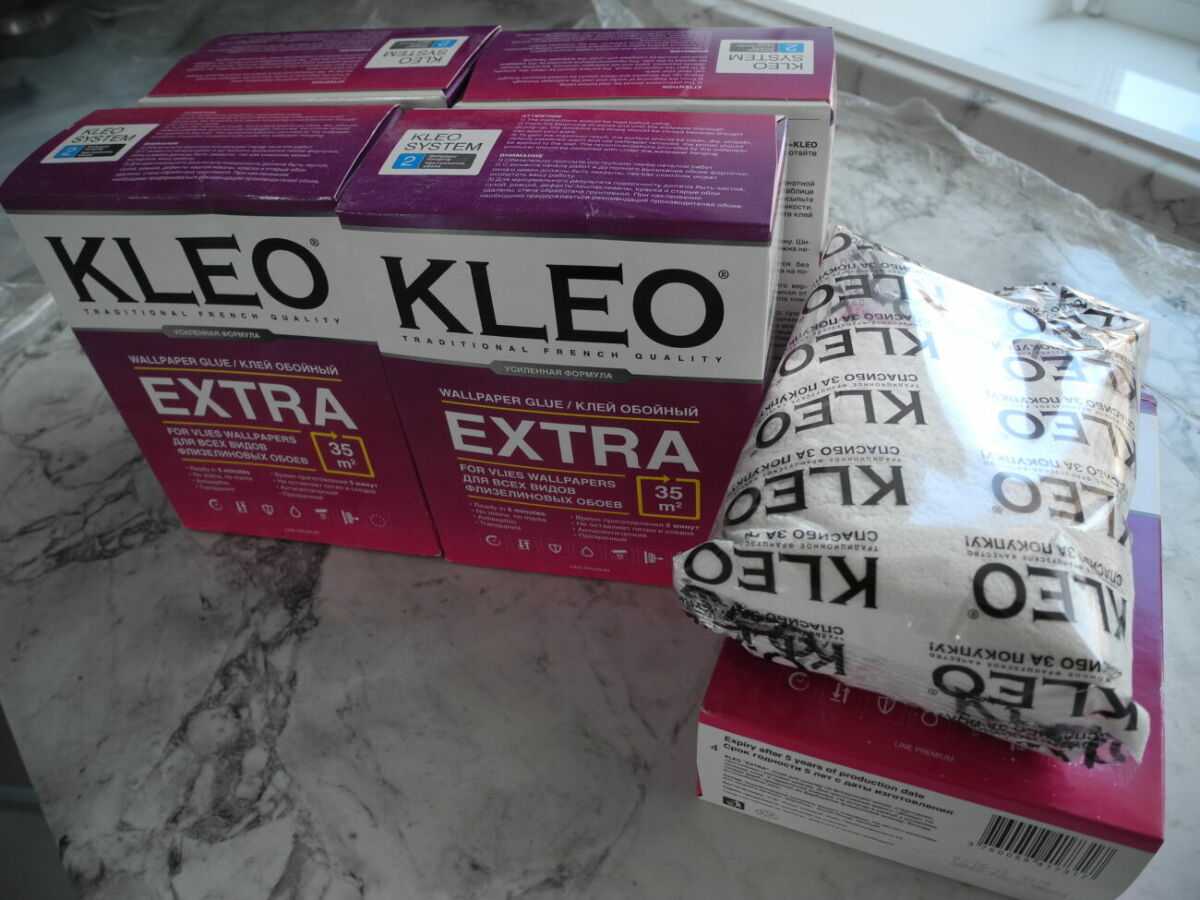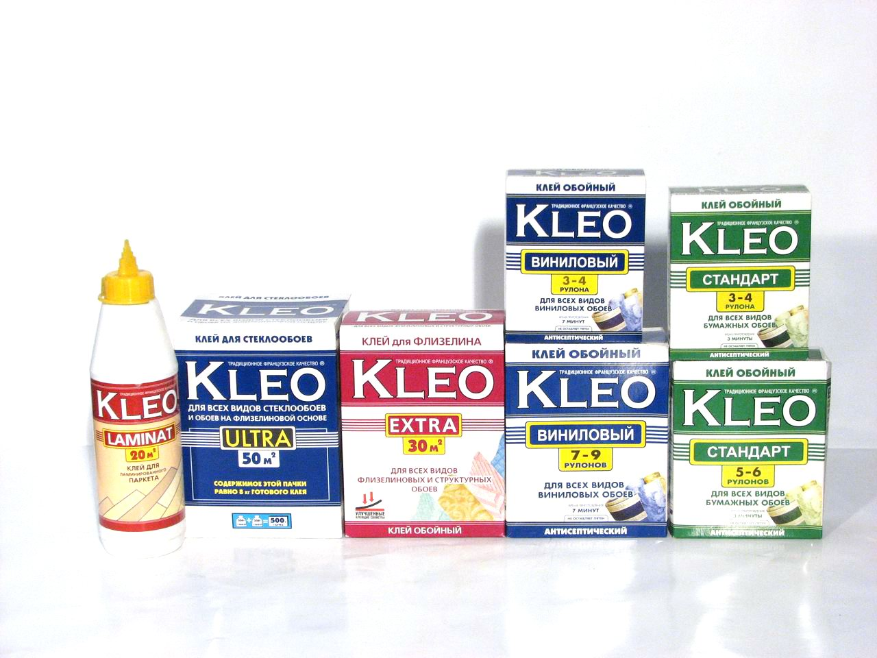 - «Kleo Extra» – особо прочный клей для обоев на флизелиновой основе, способный удерживать на стене тяжёлое и объёмное полотно. Обладает прозрачной текстурой, потому абсолютно не заметен на лицевой поверхности обоев. Клей быстро сохнет, благодаря чему окраску флизелинового покрытия можно начинать спустя пару часов после монтажа.