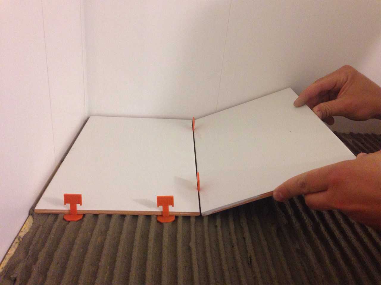 Нивелирование керамики. Первая плитка укладывается на проектное место и под каждую из её сторон, к которым будут примыкать соседние изделия, устанавливаются зажимы. Затем рядом укладывается второй лист, который клиньями выводится с первой плиткой на общий уровень, после чего лёгким постукиванием резиновой киянки под контролем пузырькового уровня добиваются их строго горизонтального положения.