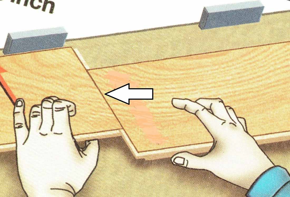 - Дощечка ламината выравнивается по ширине и ударом ладони забивается сверху.