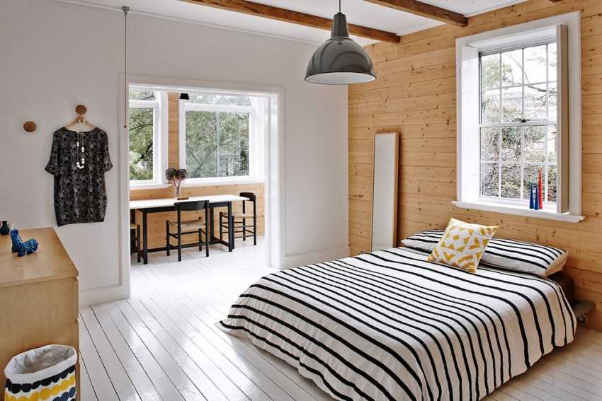 Стена и пол в спальне оформлены одинаковым ламинатом