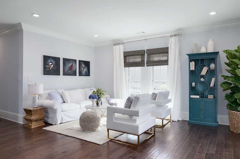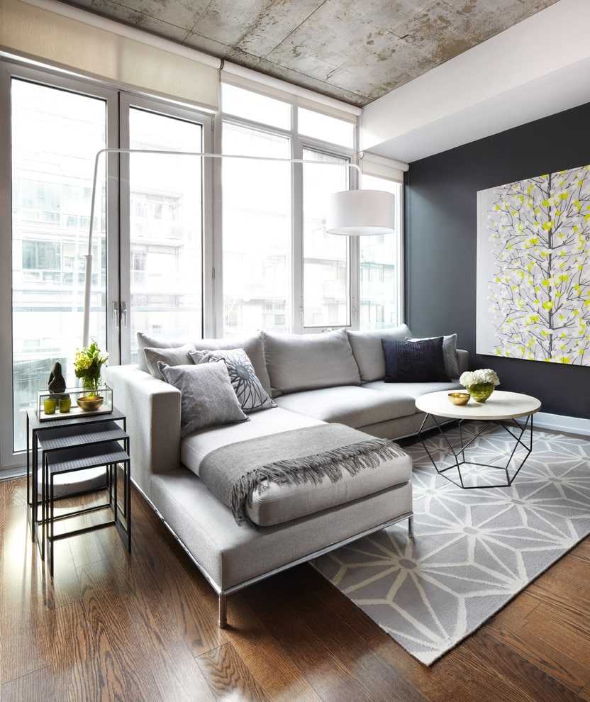 В большинстве домов эта комната представляет собой средоточие самых разных предметов мебели (шкафов, полых ниш, прочего) и нередко задействуется для разных целей: от спальни, до столовой. Поэтому чаще всего акцент переносят на диван, который желательно приобретать серого или нейтрального цвета. Впрочем, иногда поступают с точностью до наоборот. Если же комната небольшая, все выполняется в холодных тонах.
