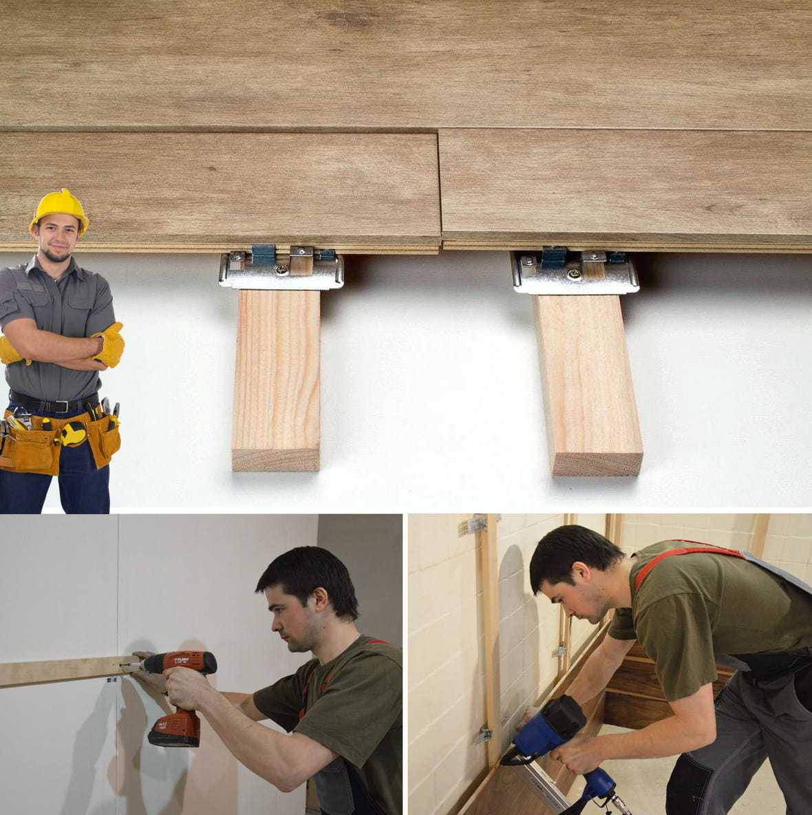- Выполняют обрешетку деревянных реек с шагом, соответствующим размерам ламината. Первый нижний ряд крепят с использованием скрытых кляймеров.