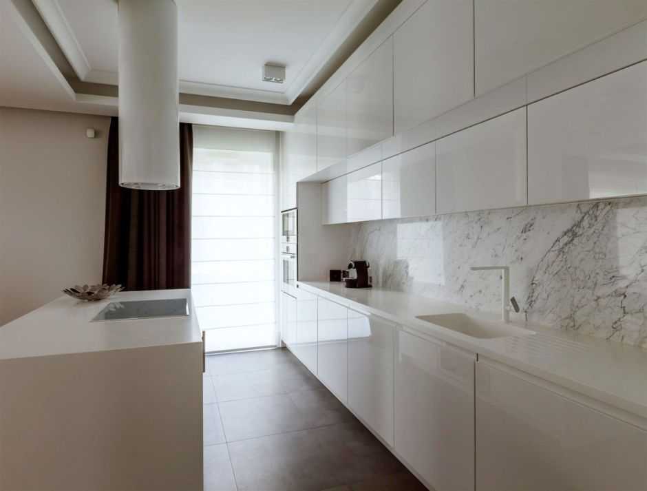 Кухня-столовая с мраморным полом глянцевой фактуры — не только практично, но и приятно глазу.