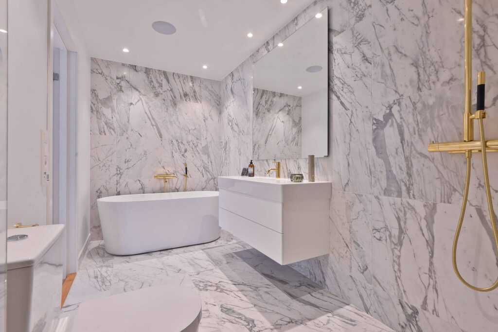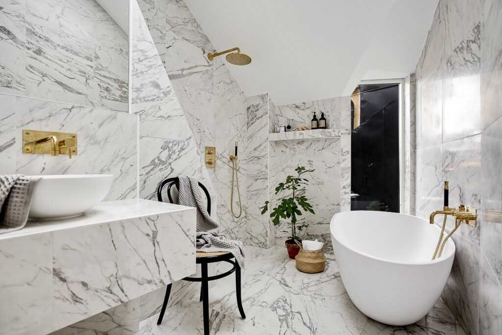 Компании защищают мрамор от водопоглощения уже на этапе обработки камня. Однако также стоит пропитать его в домашних условиях специализированными средствами. Благодаря этому вы будете уверены, что этот дорогой и красивый камень не повредится во время использования ванной комнаты. Ведь он постоянно подвергается воздействию воды и водяного пара.