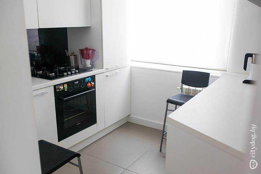 Для узкой кухни подойдет прямоугольная плитка с поперечной выкладкой.