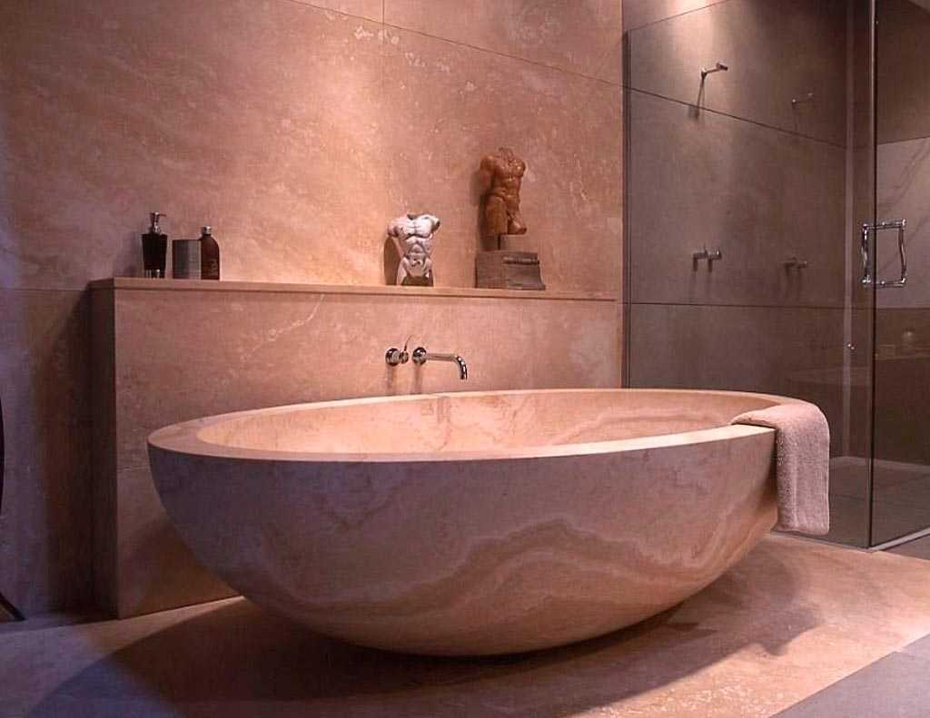 Этот природный материал стойко ассоциируется с элегантными дворцами. Дизайн ванны в мраморном стиле – это эстетично, а также практично для дома. Современные дизайнеры используют камень в изготовлении сантехники различной формы, а также в оформлении стен и пола.