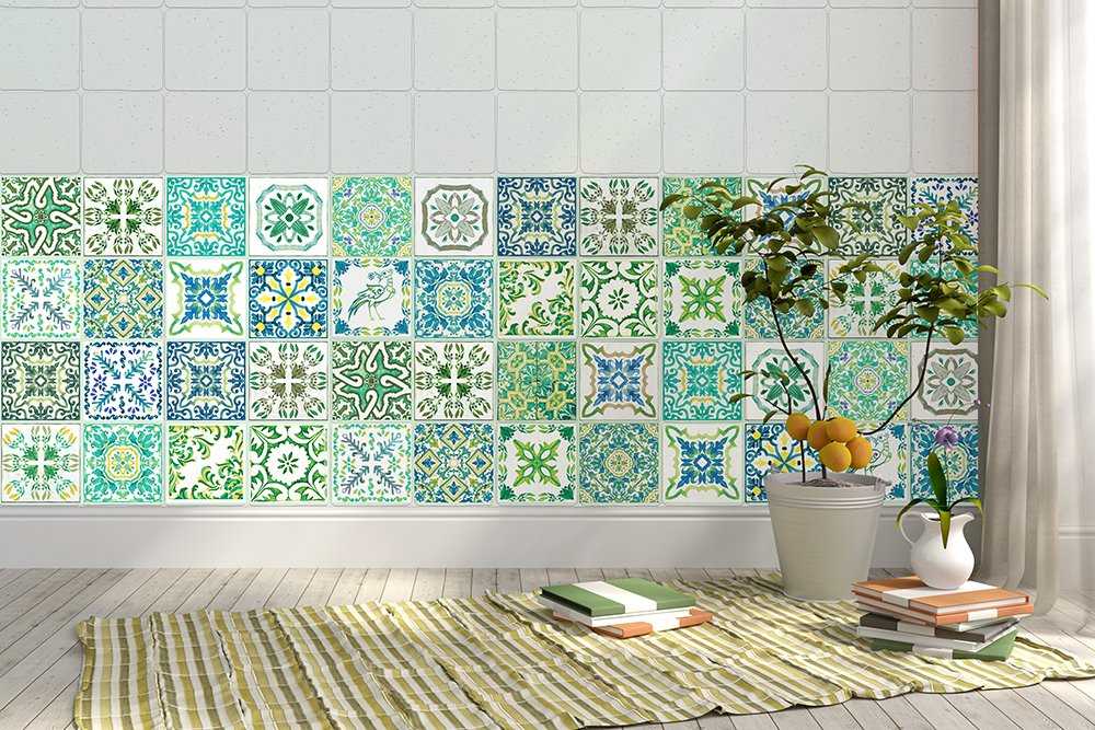 Если речь идет о художественно глазурованной плитке (например, португальской азулежу или декоративных фаянсовых пластин для облицовки), то ей можно выложить небольшой участок стены, покрытый другим материалом, например, штукатуркой или обоями