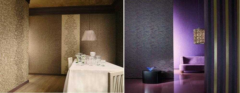 В основном, такие интересные обои используются для получения эффекта металлической, бархатной, шелковой стены.