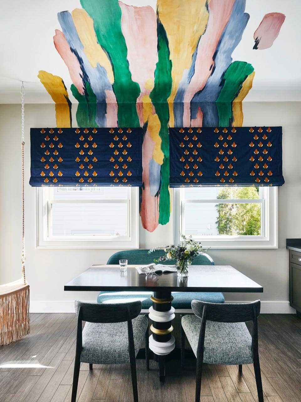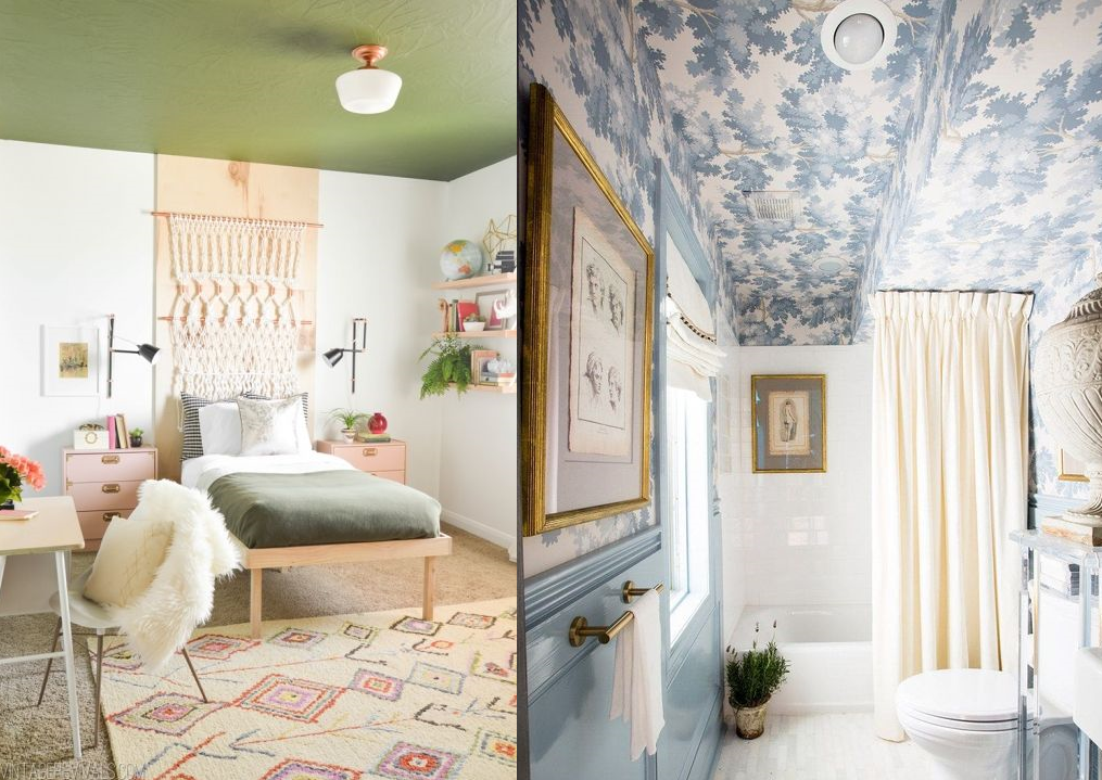 Если для рисунка на потолке ваш интерьер ещё не созрел, можно подобрать потолочные обои под покраску. Тёплые светлые тона согреют интерьер, прохладные напомнят о небе, яркие и тёмные оттенки гарантируют драматический эффект. Не обязательно «заливать» весь потолок цветом, можно выделить только одну акцентную часть, например над функциональной зоной.