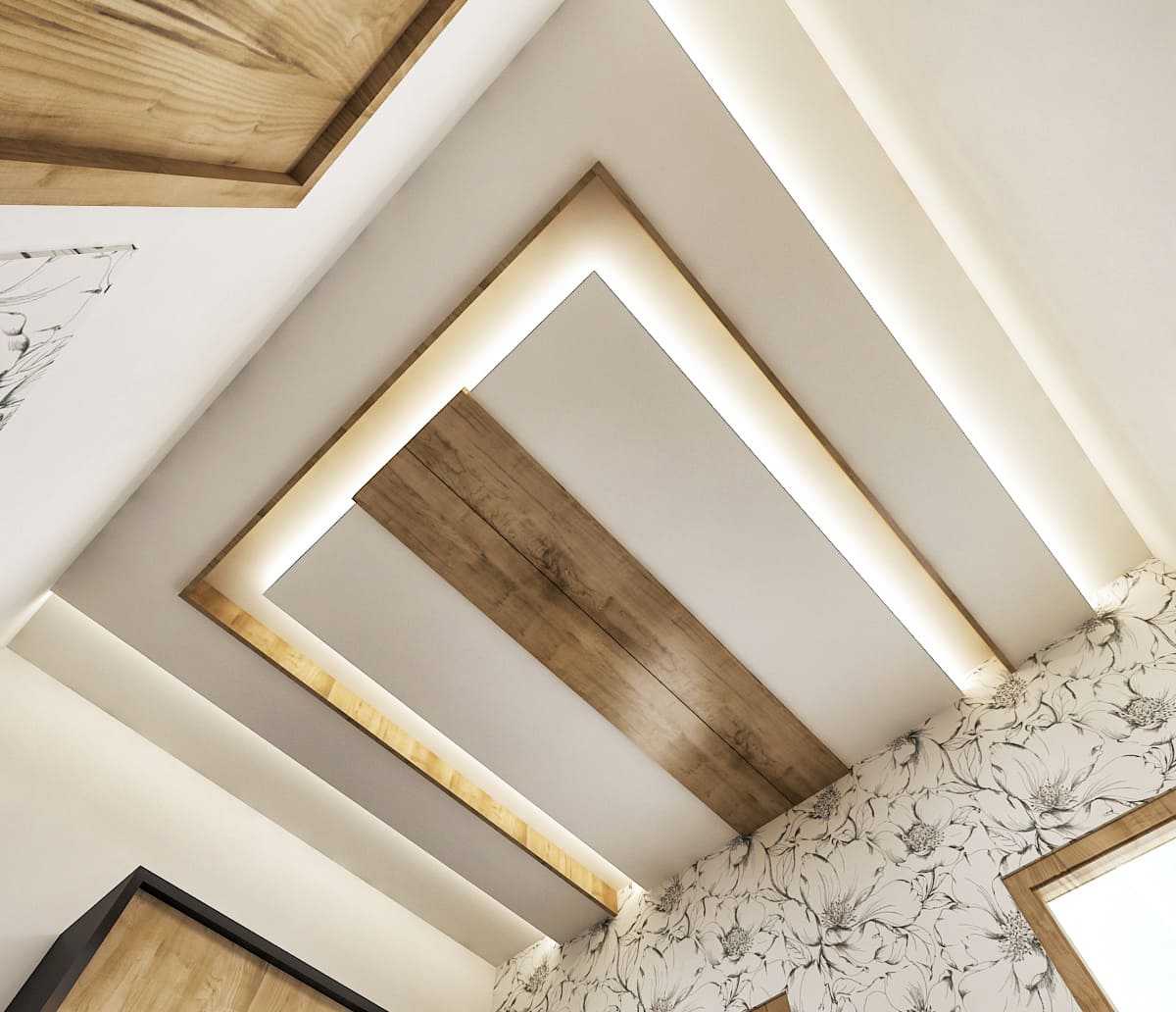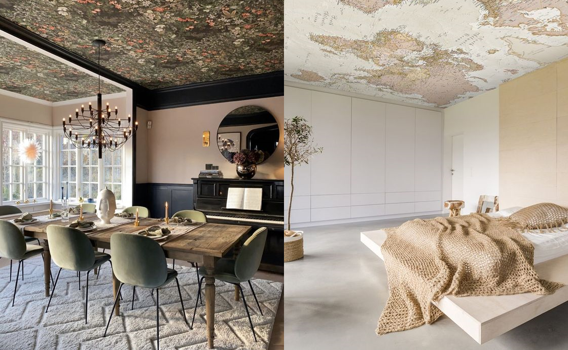 Нужно понимать, что обои с активным рисунком превращают потолок в главного героя комнаты. Он должен стать доминирующим элементом отделки, тогда как стены и пол — остаться нейтральными.