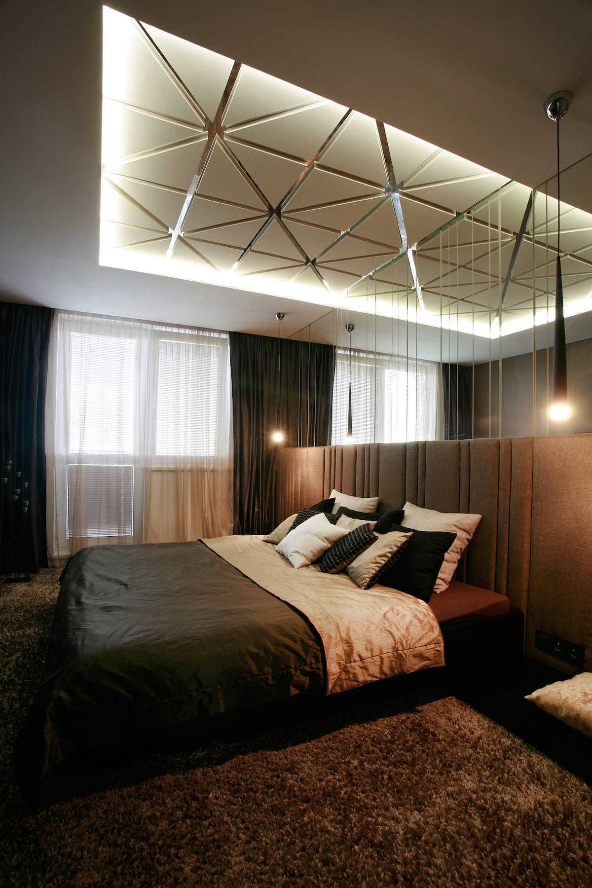 В больших и просторных спальнях многоуровневым потолком можно подчеркнуть зону с кроватью. Эффектно смотрится отзеркаленная композиция: сверху – двухуровневый потолок, а снизу – высокий подиум.