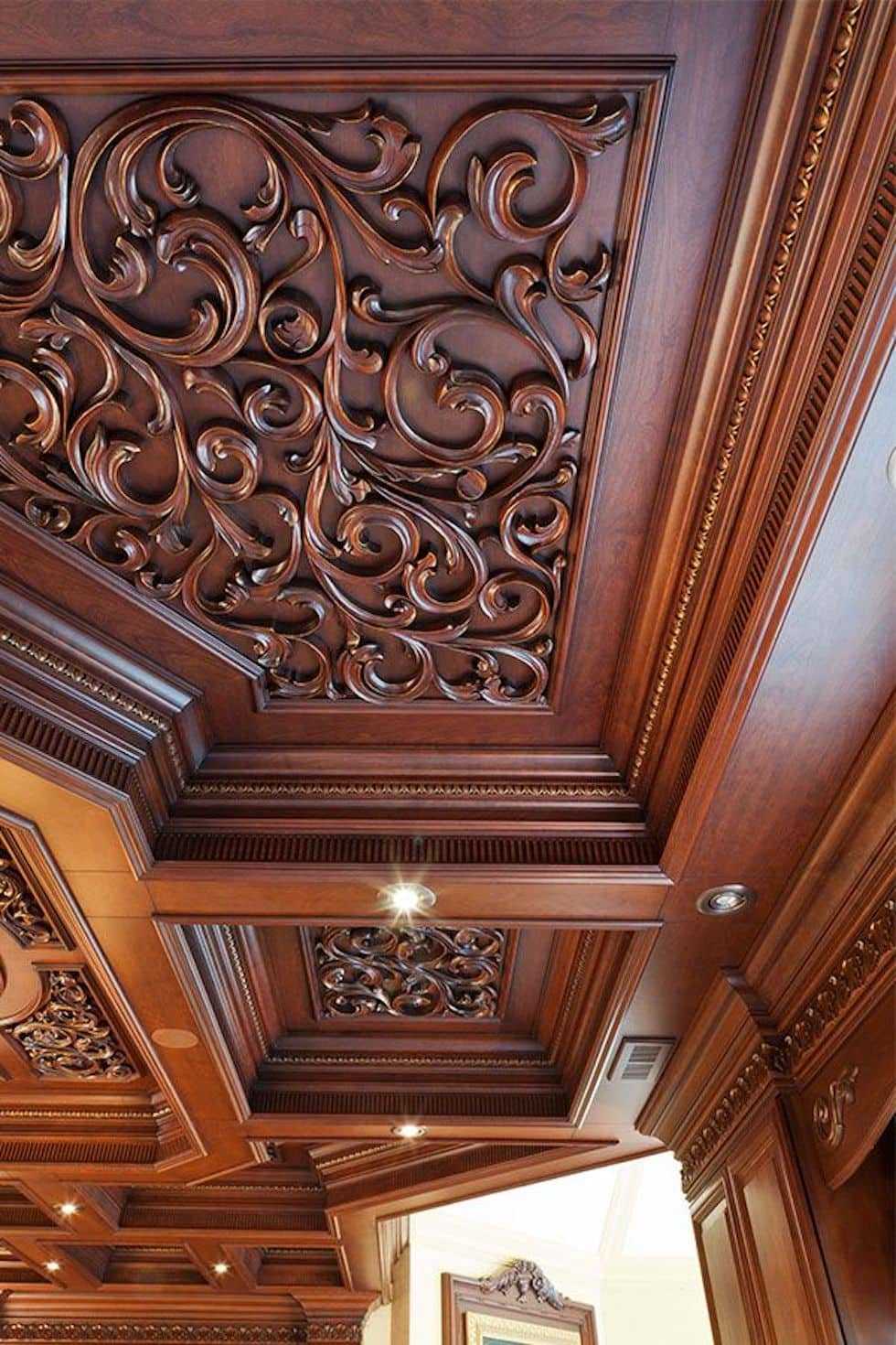 Резной потолок. Превосходно смотрится оригинальное решение потолочной поверхности при помощи ажурной или строгой геометрической резьбы. Такой элемент интерьера вносит в атмосферу комнаты уникальную нотку, делая ее современной и стильной.