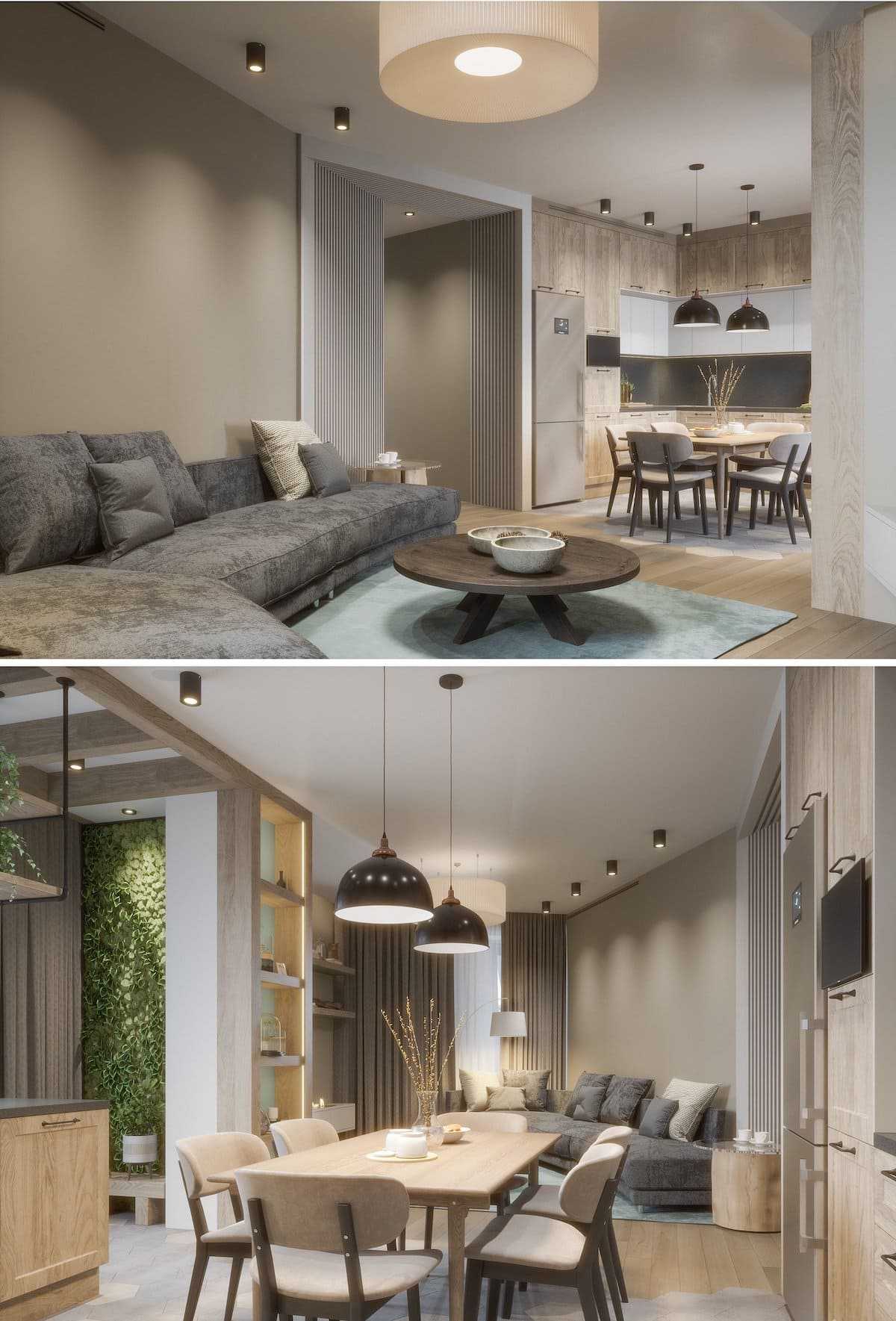 Еще одна современная тенденция — это зонирование помещений при помощи многоуровневых подвесных потолочных конструкций. В идеале визуальные границы повторяются в решении полового покрытия.