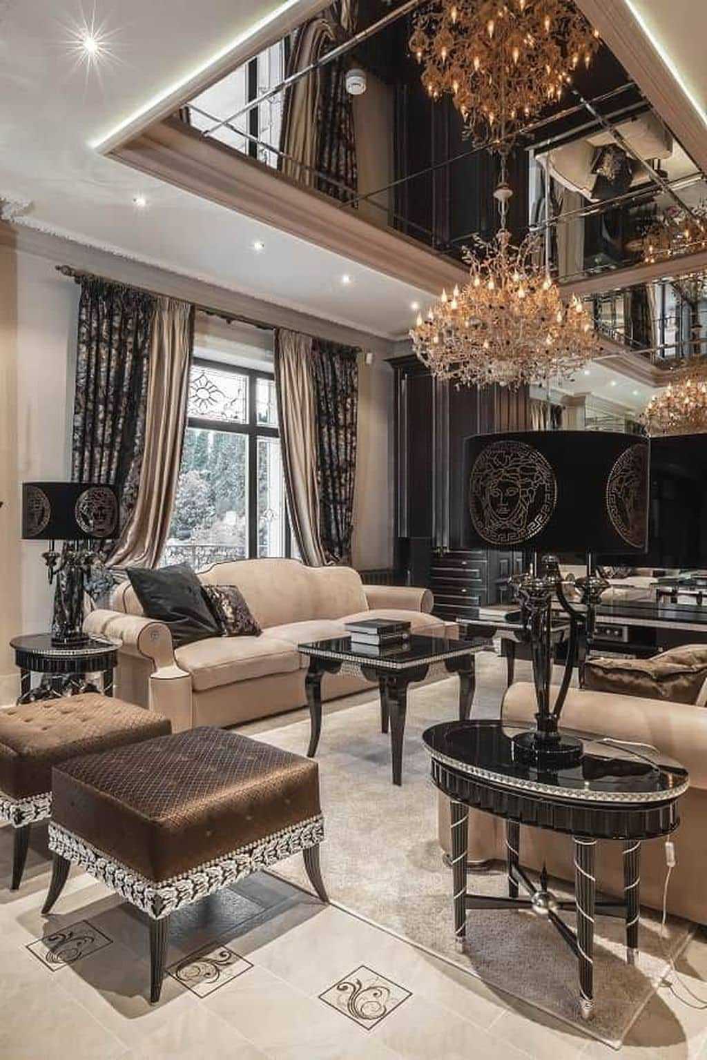 Мечтаете о яркой гостиной, но боитесь переборщить с любимыми оттенками? Темный верх комнаты приглушит любое буйство красок, а также добавит площади элегантности. Черно-белая тональность помещения всегда выглядит серьезно, роскошно и претенциозно. Поэтому идеально подходит для гостиных, холлов и больших залов в глянцевом исполнении.