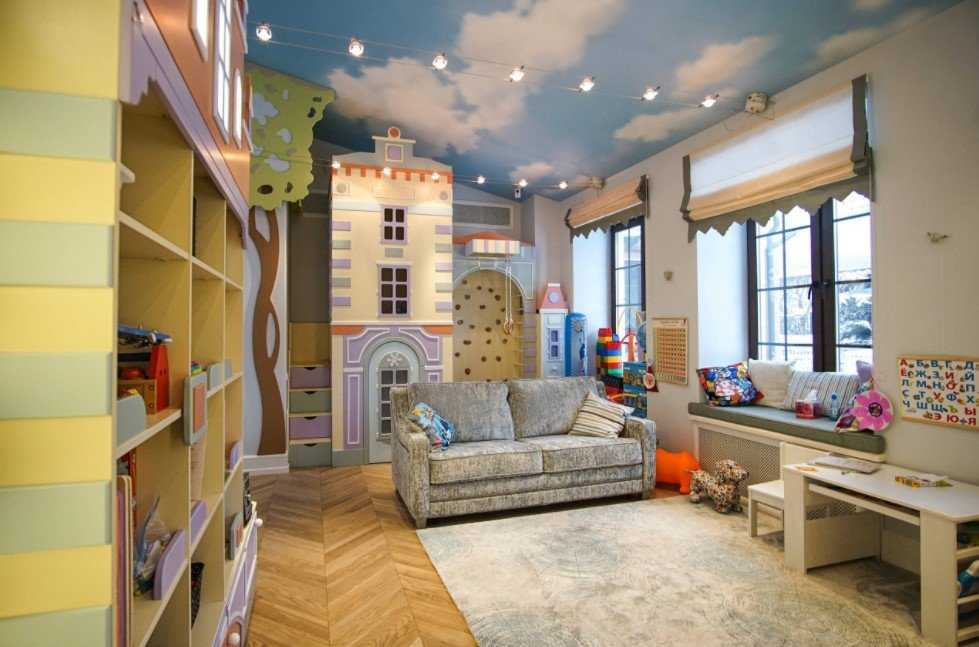 Детскую лучше оформить с учетом психологии ребенка. Для потолка лучше светлые тона: небесный, бежевый или белый. Можно добавить нежный рисунок.