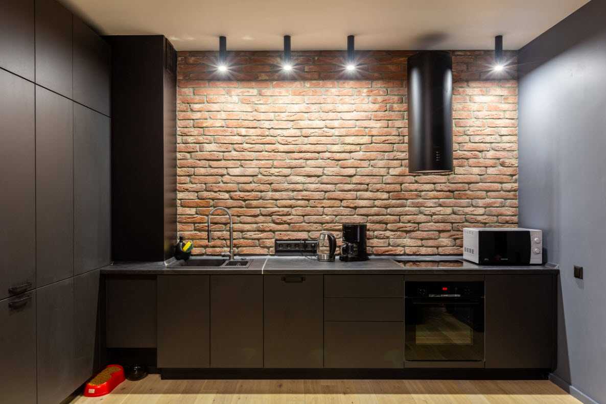 Если хозяевам квартиры повезло, и она находится в старом доме, натуральный кирпич самый простой вариант отделки для кухни. Достаточно снять старое покрытие, чтобы добраться до кирпича. Для придания поверхности презентабельного вида, ее покрывают лаком или краской. Дополнительный слой защитит кирпич от грязи и пыли, за такой отделкой проще ухаживать в условиях кухни.