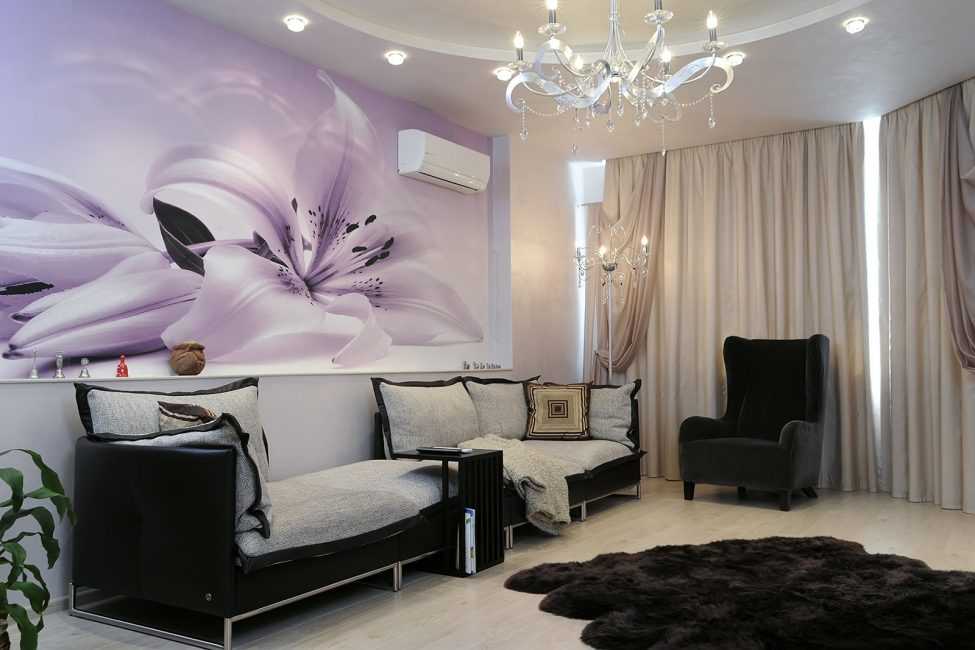 Очень интересное решение, на наш взгляд, зонировать комнату при использовании одновременно сиреневых обоев разных оттенков или однотонной расцветки и материала с рисунком или орнаментом. Стена в лавандовом цвете вместе с крупным рисунком позволит обустроить зону отдыха, где есть диван. Зону, где есть телевизор лучше оформить в светло-сиреневом оттенке или обоями без ненавязчивого орнамента. Насыщенный цвет «сирени» поможет создать яркий акцент в гостиной, на этой стене могут располагаться картины, книжные полки или бра.