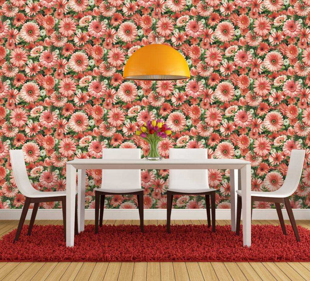Цветочными обоями оклеивают все четыре стены. Обязательно какое-либо дополнение к ним в интерьере – диванные подушки, скатерти, обивка мебели. Иногда цветки на стенах комбинируются с клеткой или полоской.