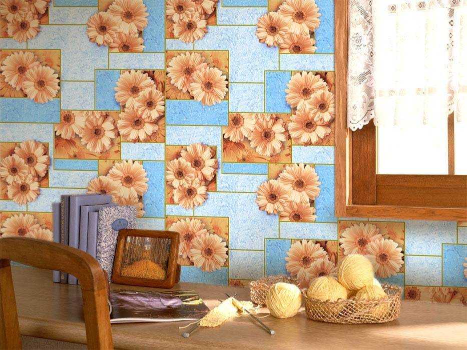 Большие ромашки окрашенные в цвета радуги. Обои с мелкими герберами особенно подойдут для частичной отделки.