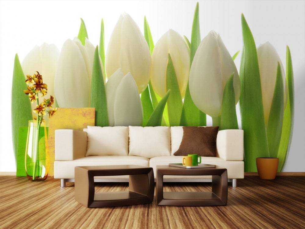 На фото гостиная с фотообоями с изображением тюльпанов.
