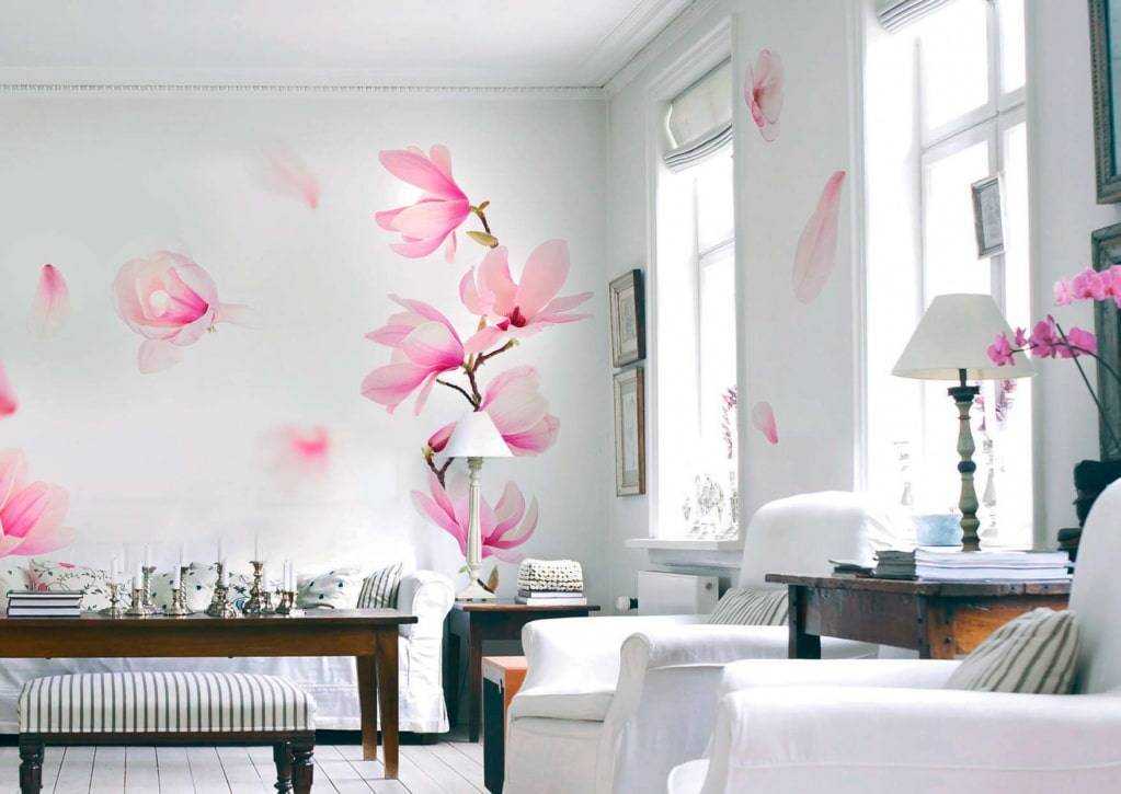 На фото гостиная со стенами оформленными обоями с изображением магнолии.