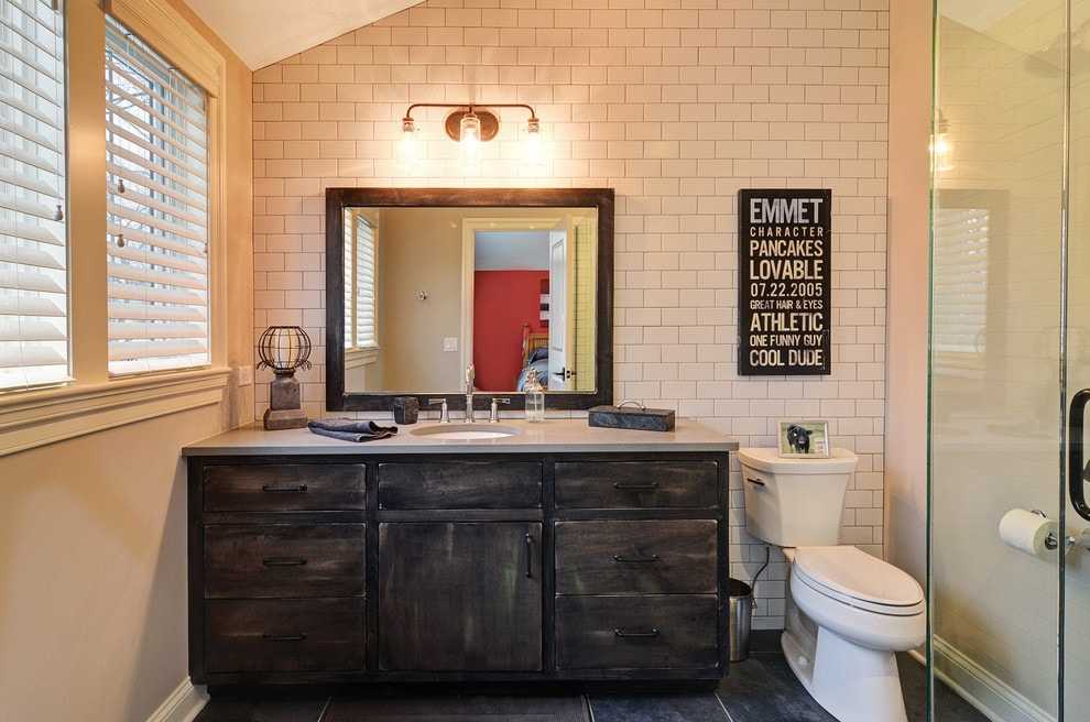 В уборной и ванной комнате можно использовать плитку. Зачастую она матовая, однотонная, но также существует материал с орнаментами или текстурой под дерево.