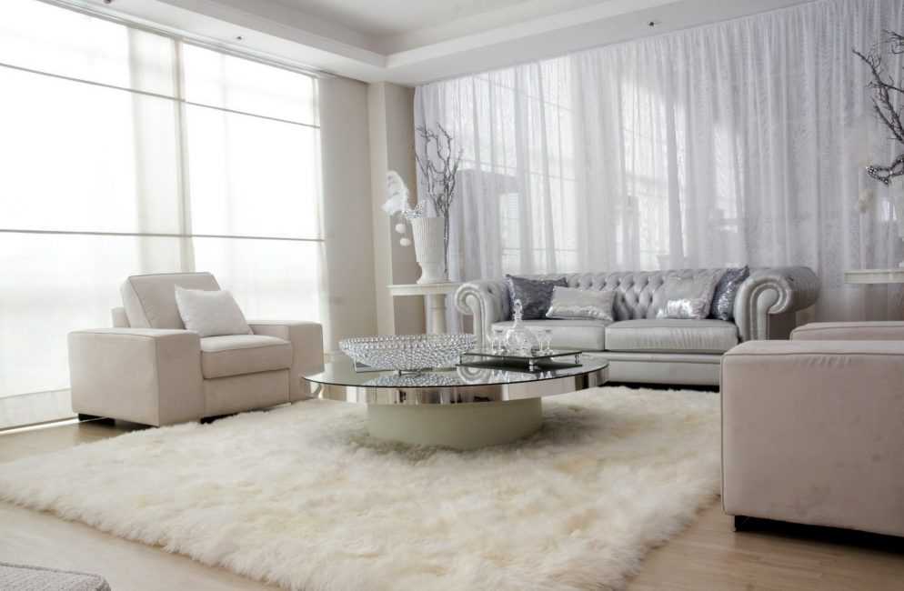 Идеальным решением станет такая напольная поверхность белого цвета для современной гостиной, особенно если стены здесь создают яркий контраст. В белом цвете мы советуем подобрать кожаный диван и кресла (с хромированными ножками). Кроме стен создать красивый контраст позволят яркие шторы.