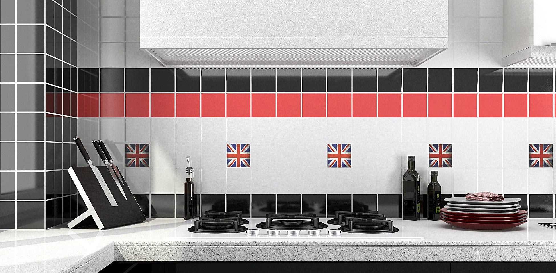 Кухня под британским флагом – декор с флагом страны. Представляет собой набор глянцевой плитки и собственно декора. Вписать этот необычный декор можно в интерьер со многими видами плитки и разными цветами – it’s up to you!