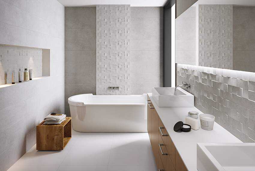 Плитка гресс имеет не только отличные свойства, но и фантастический вид. Керамогранитная плитка для ванной комнаты сенсационно имитирует другие материалы, например натуральный камень или дерево. Вы также легко найдете плитку, имитирующую бетон, которая подчеркнет промышленное оформление ванной комнаты.