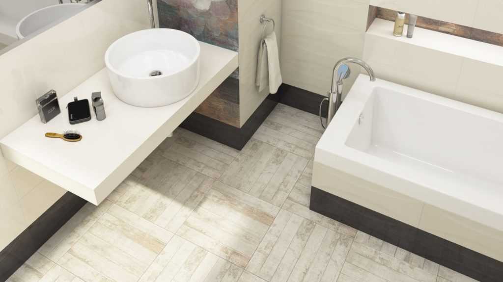 Дизайн ванной комнаты под дерево подразумевает и соответствующее напольное покрытие. Кроме высокого уровня влагостойкости, для напольного покрытия очень актуальна его прочность и защита от деформаций: