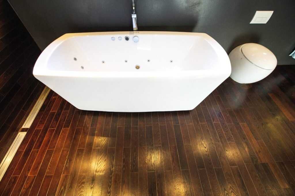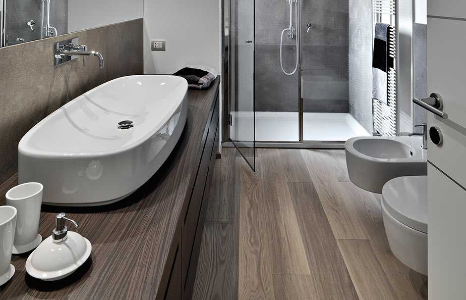 Керамогранит с имитацией дерева идеально подходит для облицовки ванной комнаты.