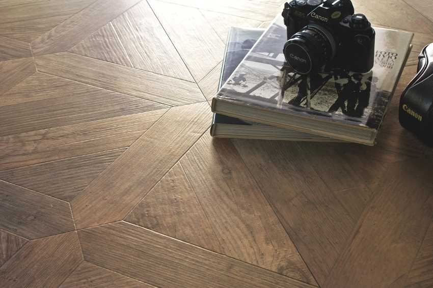 Классическая или состаренная плитка под паркетную доску. Это рустик, антик. Такая облицовка может повторить узор паркета, выложенной палубным типом, елочкой, квадратами и прочими рисунками. Коллекции выпускаются в разных формах: удлиненные плашки, квадраты, что облегчает процесс выкладки
