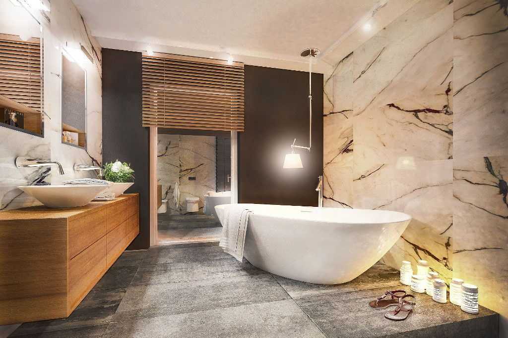 Самый популярный способ отделки ванной комнаты — это использование керамической плитки. Если вы хотите более элегантный эффект, выберите натуральный камень для стены. Вы можете применить его по всей комнате — все, что ему нужно, это правильно пропитать. С помощью камня вы также можете выделить часть интерьера, например, душевую кабину, в которой вы можете нанести материал, отличный от других стен в ванной комнате.
