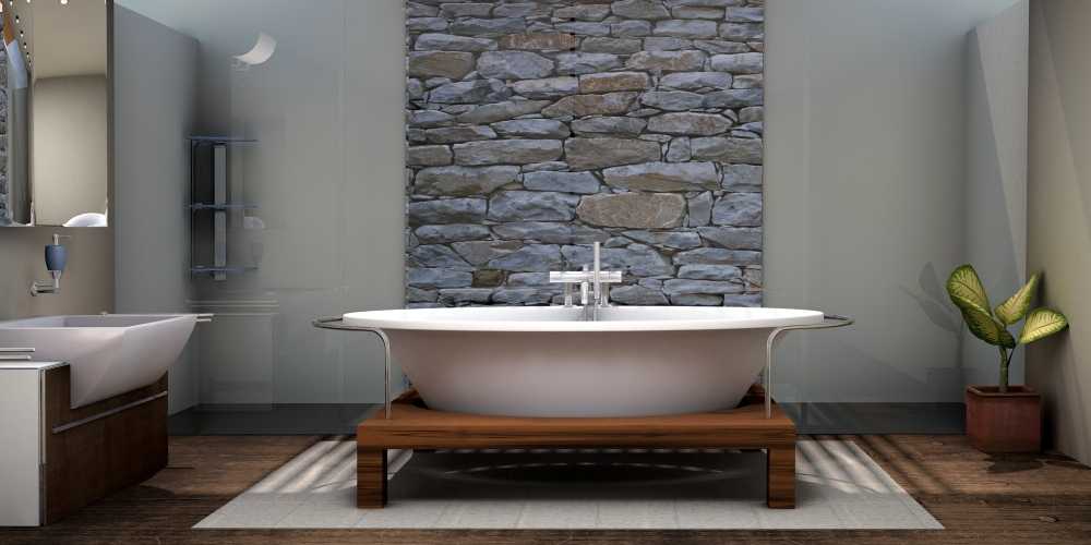 Каменные стены в ванной будут эффектно смотреться и сохранят свой эстетический вид надолго благодаря пропитке. Для этой комнаты подойдет гранит, Известняк также подойдет, но он должен быть надлежащим образом защищен, чтобы не впитывать влагу.