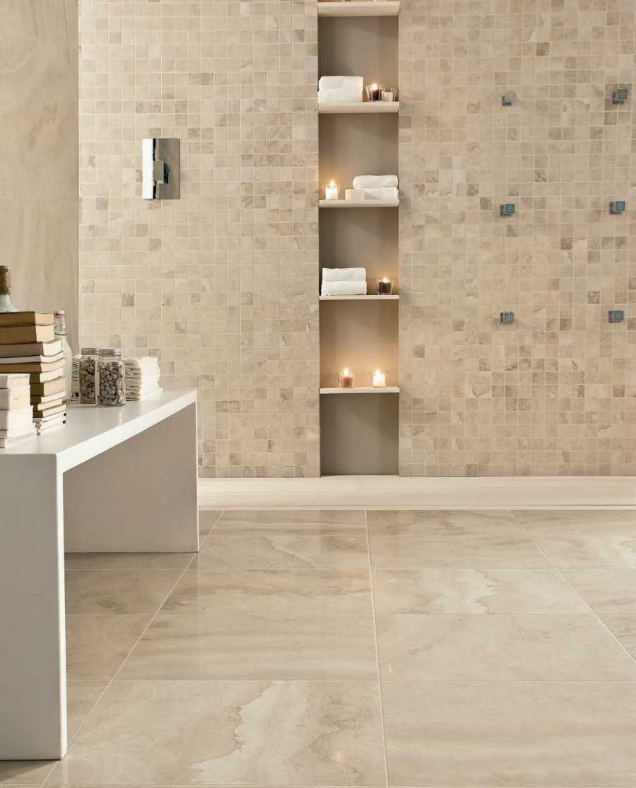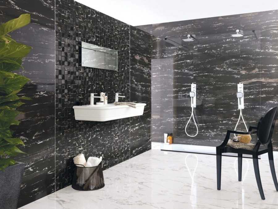 Мраморная плитка часто используется на всех стенах и полах ванных комнат. Большой популярностью пользуется крупноформатная плитка и ректифицированная (бесшовная) плитка, позволяющая добиться эффекта однородных поверхностей. Вместе с блестящей, почти зеркальной поверхностью она создает в интерьере ослепительное впечатление. Но содержать ее в безупречной чистоте может быть непросто.