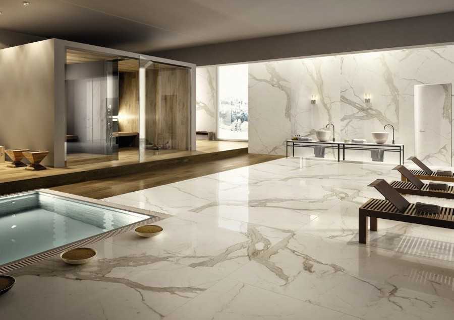 Нередко большие помещения, обладающие значительной площадью поверхности пола, покрывают внушительными и солидными по размеру мраморными пластинками. Крупноформатная плитка имеет размер от квадрата со стороной 600 мм до 1200х600, 1200х1200 и даже 1200х2400 мм.