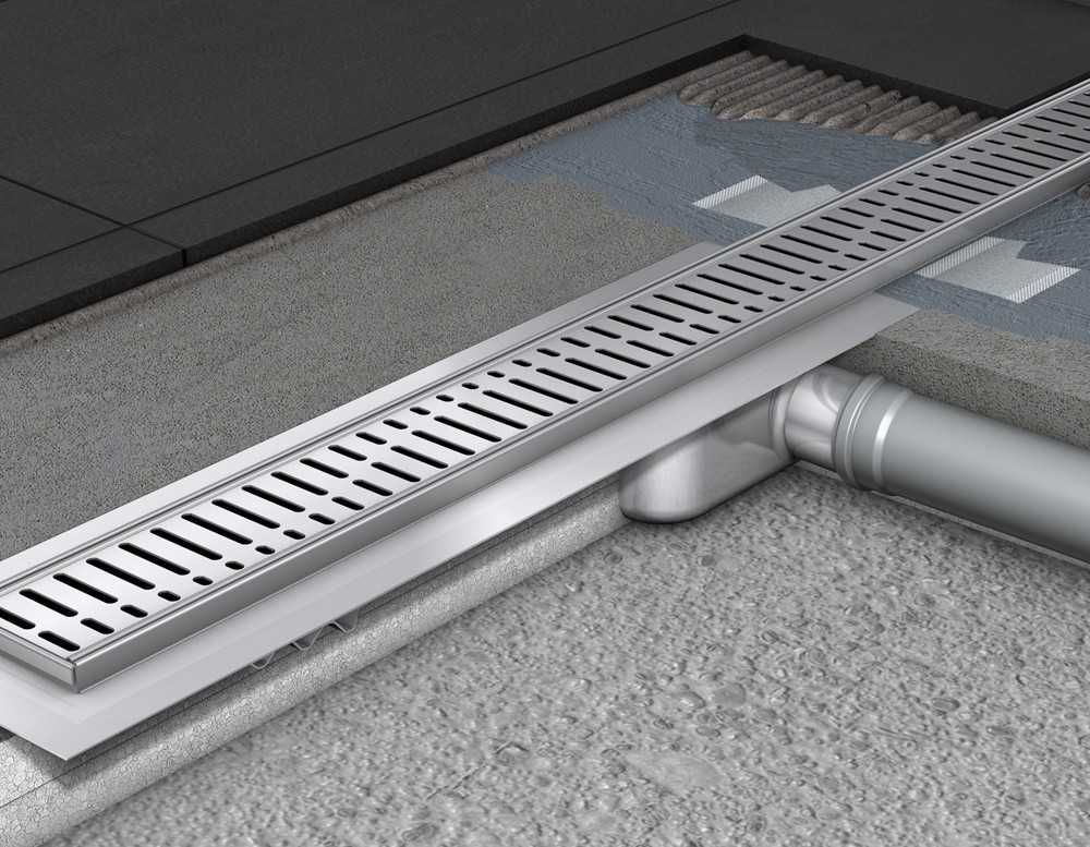 - линейными – длинный желоб с жесткой решеткой, располагаемый возле стенки кабины, и соединенный по трубе с канализационным стоком. Такой тип слива обладает высокой приемной способностью, поэтому чаще всего его используют в больших душевых;