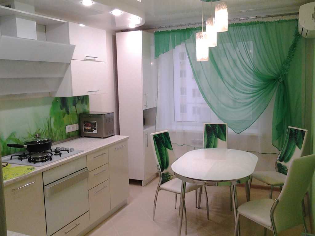 Благодаря многообразию оттенков, зеленые занавески могут как транслировать определенную концептуальную идею, так и просто создавать в помещении спокойную и уютную атмосферу. Они отлично подходят для кухни, благодаря природности цвета. Однако необходимо учитывать общую цветовую гамму помещения, т.к. зеленый не является универсальным колером.