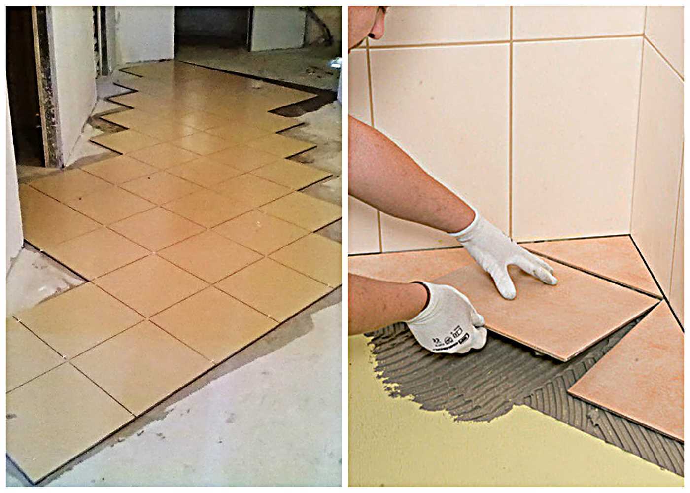 - периметр комнаты проходят, укладывая плитку ровно, а середину укладывают по диагонали, начиная с угла;