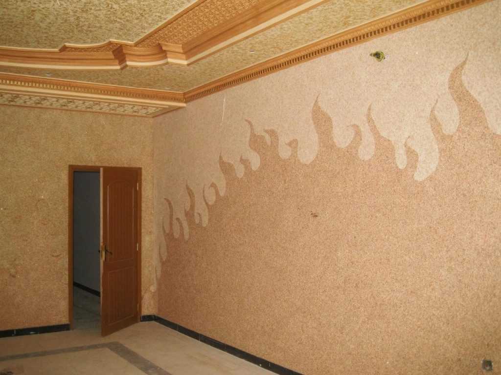- Жидкие обои, особенно с рисунком, успешно маскируют на поверхностях стены мелкие дефекты в виде неровностей и трещин.