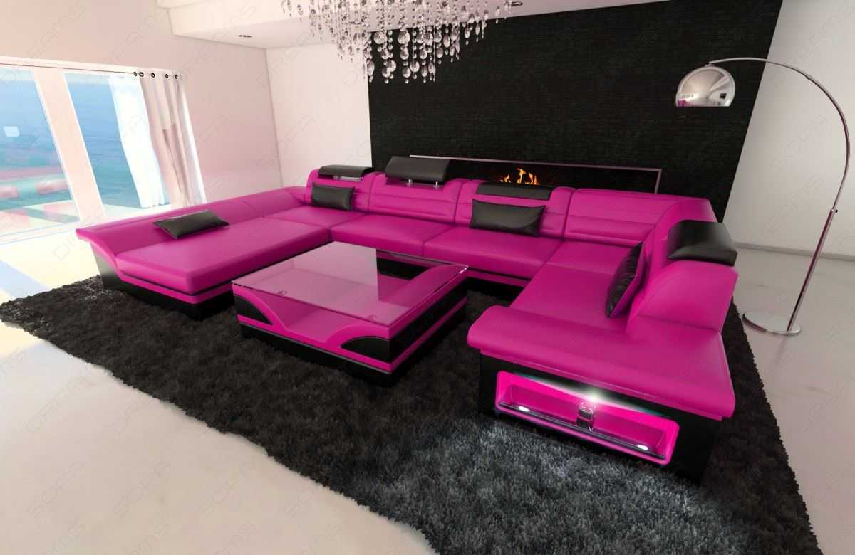 - Бело-розовый – гламурный. Белый удвоит ощущения мягкости, воздушности и нежности пурпурно-розовому (яркий светящийся) дивану в интерьере гостиной, если будут использованы дорогие фактуры и много света.
