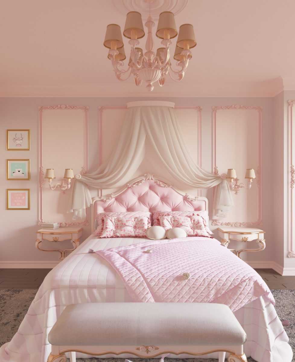 Розовый цвет широко применяется при оформлении спален девочек. Конечно, можно сделать отделку или мебель яркой, приблизив интерьер к «стилю куклы Барби», но чаще всего такая обстановка быстро надоедает. Лучше не вводить много насыщенных тонов, а отдать предпочтение тем, что способны умиротворять, вызывать ощущение волшебства и нежности. Базовым цветом стоит сделать пастельный или бледно-розовый, а для сочных оттенков отвести игровой уголок или применить их в аксессуарах.