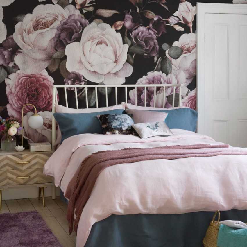 - Фотообои с изображением цветочного или растительного орнамента в розовом цвете прекрасно будут смотреться в изголовье кровати.