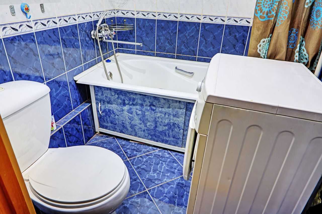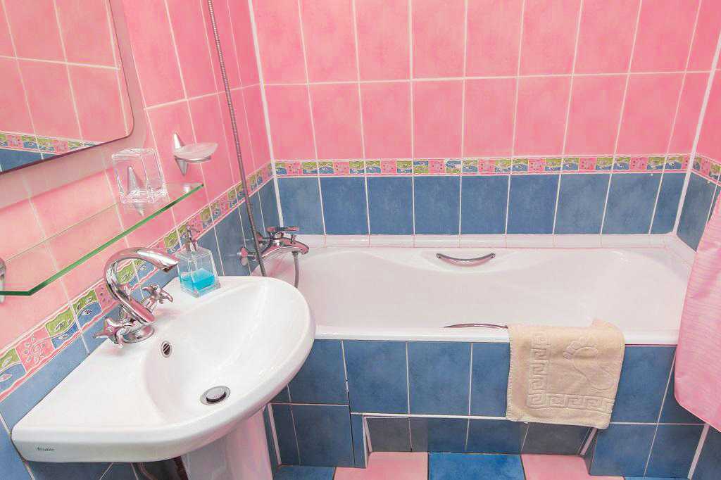 - Стенки красят, распространённый вариант ПВХ-панели, но лидирующие позиции всё-таки у синей плитки для ванной и её метлахской версии.